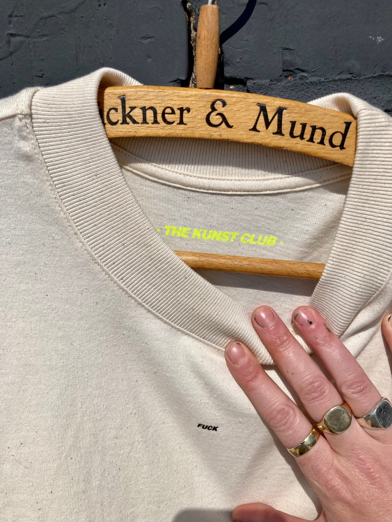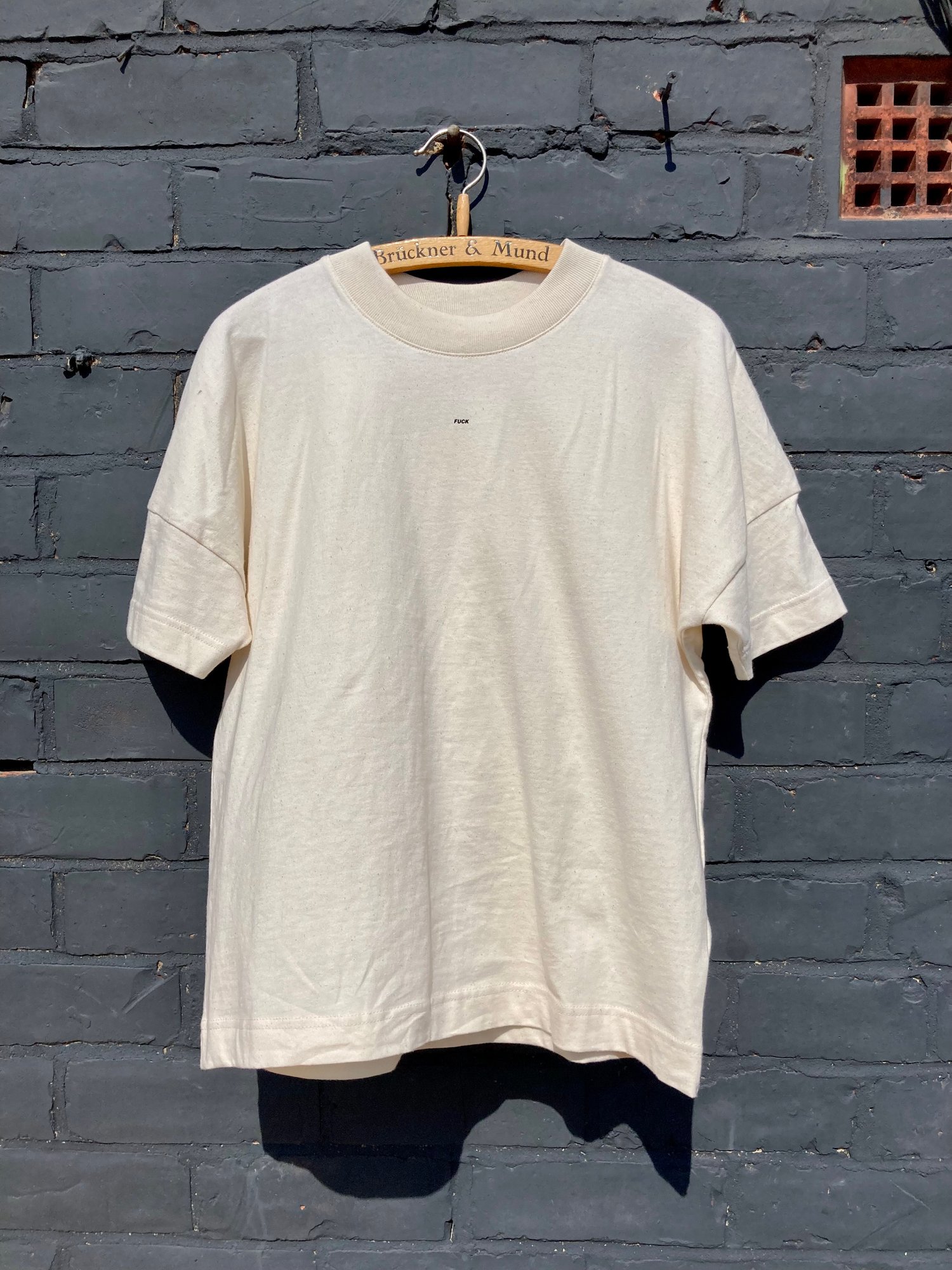 Super class organic, unbleached cotton, fair wear shirts with a little screenprint on.